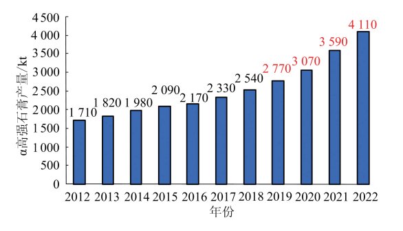 近几年,国内企业积极投入利用工业副产石膏生产高强石膏的研发,特别是采用水热法制备高强石膏的研究取得了较好的进展。据预测,2020年α高强石膏产量为3070Kt。