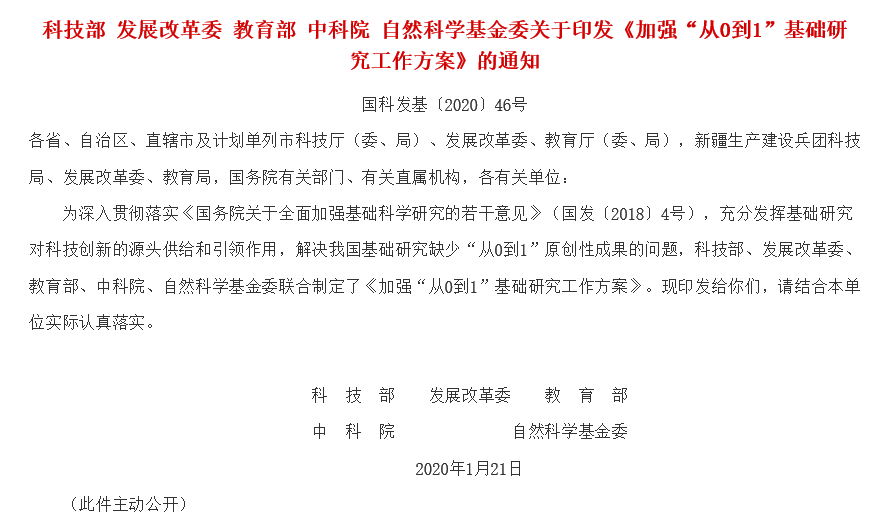为贯彻落实党的十九大精神和《国务院关于全面加强基础科学研究的若干意见》(国发〔2018〕4号),切实解决我国基础研究缺少“从0到1”原创性成果的问题,充分发挥基础研究对科技创新的源头供给和引领作用,制定工作方案如下。
