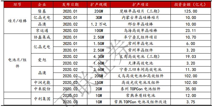 2020年初至今光伏配件企业增产计划