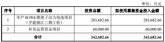 根据孚能科技提交的招股书说明,公司计划募资34.37亿元,主要用于年产 8GWh 锂离子动力电池项目(孚能镇江三期工程)和补充运营资金项目。其中,年产 8GWh 锂离子动力电池项目是公司为进一步扩大生产规模,通过孚能镇江实施的镇江三期工程项目。