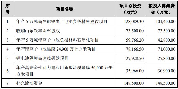 璞泰来计划在内蒙古乌兰察布市建设“年产5万吨锂离子电池负极材料石墨化项目”,该项目总投资5.98亿元,使用募集资金4.28亿元,建设周期两年。璞泰来表示,该项目结合“年产 5 万吨高性能锂离子电池负极材料建设项目”,将可实现公司负极材料加工生产工序全覆盖,生产一体化,降低生产成本,提高产品竞争力。此外,考虑到负极材料石墨化加工中的主要成本为电力成本,而本次募投项目的实施地点具有区位优势,可以大幅度降低电力成本从而降低石墨化的加工成本。