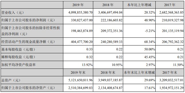 中国粉体网讯 3月30日晚间,拓邦股份发布2019年年报,公司去年实现营业总收入41亿,同比增长20.3%;实现归属于母公司所有者的净利润3.3亿,同比增长48.9%;每股收益为0.33元。报告期内,公司毛利率为22%,较上年提高2.0个百分点,净利率为8.3%,较上年提高1.4个百分点。