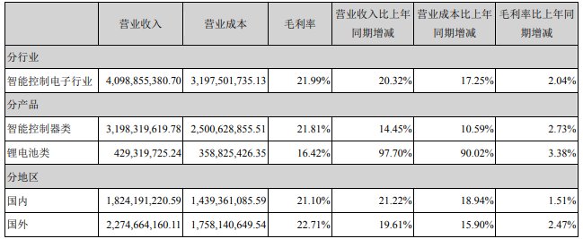 资料显示,拓邦股份现有主营业务呈现“一体两翼”形态,“一体”为智能控制器的研发、生产和销售,“两翼”分别为高效电机和锂电池的研发、生产和销售。
