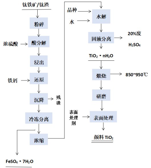 主要以钛铁矿或酸溶性钛渣为原料,用硫酸将钛原料分解成TiOSiO4溶液再进行除杂、分离,最终获得成品钛白粉。