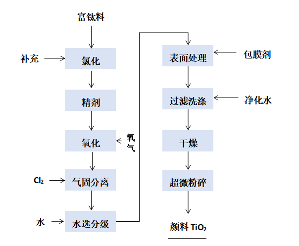 氯化法工艺用富钛料,如天然金红石、人造金红石、高钛渣或UGS渣等,与氯气反应生四氯化钛等,再将精制后的四氯化钛进行气相氧化获得粗二氧化钛,后处理获得高品质的钛白粉。