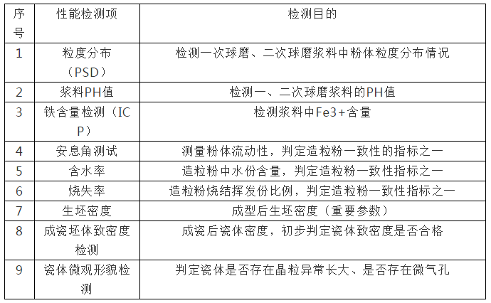 半成品/过程检测主要包括一次球磨浆料、预烧粉、二次球磨浆料的物理性能检测。其主要检测项包括:一次球磨粒度分布、二次球磨粒度分布、浆料PH值检测、铁含量检测、造粒粉安息角、含水率、烧失率检测、成型后生坯密度检测、生坯烧结成瓷后收缩率、致密度检测、瓷体微观形貌检测。