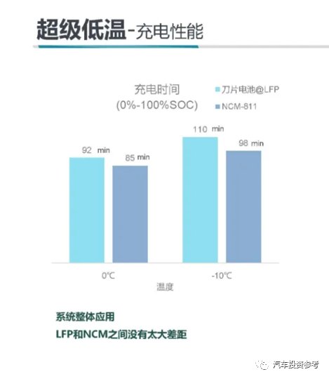 在-10℃的环境下,刀片电池能够在110分钟内从0充电至100%。同等情况下,NCM电池需要98分钟。