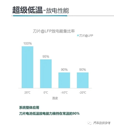 25℃是刀片电池最佳工作温度,此时其放电能量比率为100%。随着温度的降低,这一比例将逐步下降;但在-10℃和-20℃时,都能稳定在90%。