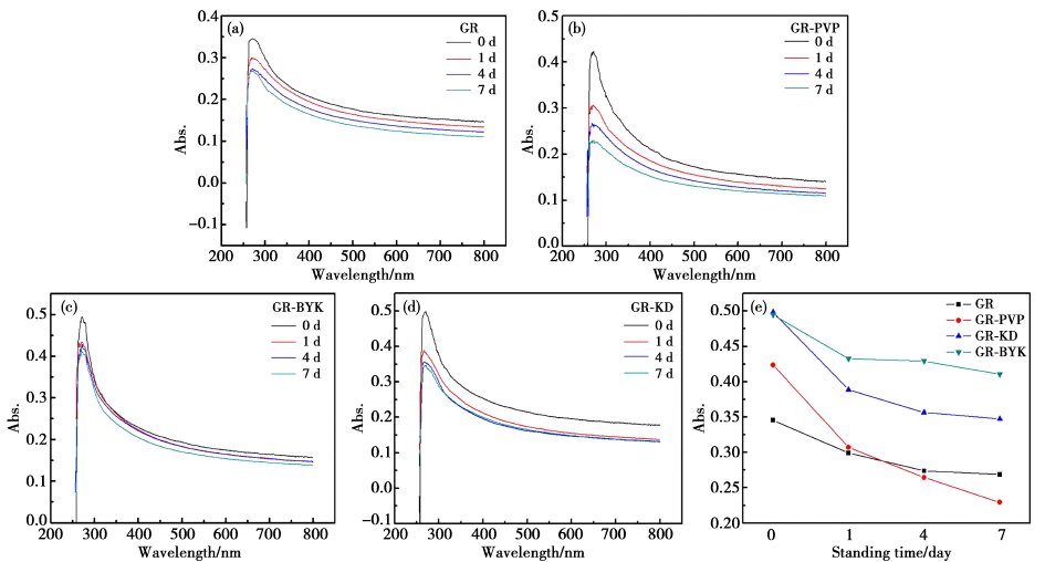 制备出GR-PVP、GR-KD、GR-BYK四种石墨烯浆料后,分别在静置0d、1d、4d、7d时进行紫外吸收光谱测试。四种浆料静置不同时间的紫外吸收光谱如图所示: