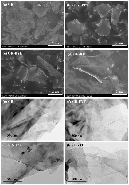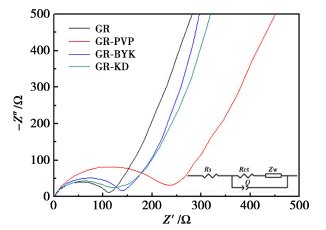 分别向预处理的PVP、KD1、BYK-2150分散剂溶液中加入石墨烯,经过再处理后获得石墨烯和分散剂含量均为1%的导电浆料。分别命名为GR-PVP、GR-KD、GR-BYK。另外,在不加任何分散剂的情况下,采用相同的步骤配制出质量分数为1%的石墨烯浆料作为对比该浆料命名为GR。