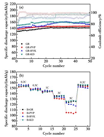 以KD1和BYK-2150作为石墨烯的分散剂,结合砂磨和超声分散等物理手段,从而获得质量分数为1%的石墨烯导电浆料。测试表明石墨烯浆料的分散浓度和稳定性均有所提高。以磷酸铁锂为正极材料,GR-KD和GR-BYK为导电浆料制备的扣式电池在0.2C倍率下的首次放电比容量分别为150.7mAh/g和156.1mAh/g,首次放电效率分别为94.4%和97.7%;在1C倍率下循环50次后,比容量保持在152.5mAh/g和159.7mAh/g,且GR-KD表现出良好的倍率性能。