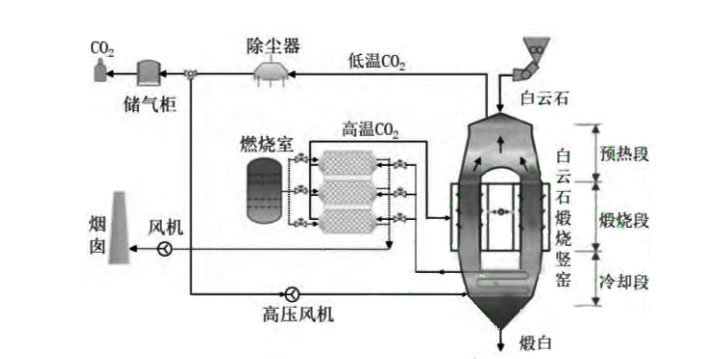 回转窑是传统白云石煅烧的主要装备,在煅烧过程中窑体连续转动,使物料与高温烟气充分接触。蒋滨繁等在《基于CO2循环的低碳高效白云石煅烧新工艺》一文中,针对白云石煅烧过程中 CO2 排放严重等问题,构建了基于 CO2 循环载热与资源化回收的白云石低碳煅烧竖窑新工艺。