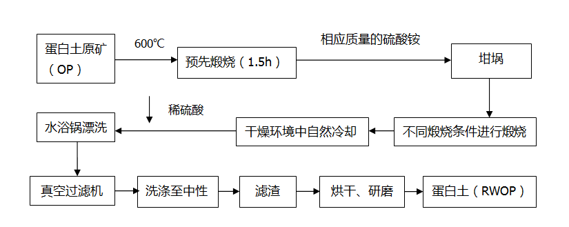 刘阳钰等在《蛋白土硫酸铵煅烧增白工艺研究》一文中,首次采用预先煅烧的方法去除蛋白土中有机杂质并将其中所含有的铁元素转化为Fe2O3,然后采用硫酸铵煅烧法来增白预先煅烧后的蛋白土。
