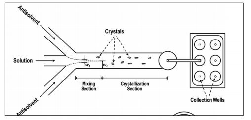 微流体液滴结晶法是在球形聚结和准乳液溶剂扩散基础上开发出来的一种新型球形结晶技术。利用微流体技术可以产生粒径比较均匀的单分散型液滴。通过蒸发结晶、冷却结晶或萃取结晶的方式,控制液滴内的晶体的成核与生长速率可以得到球形产品。该方法具有球形产品不易聚结,粒度分布均匀等优点。目前研究人员已经利用这种方法得到了甘氨酸和氯化钾的球形产品。