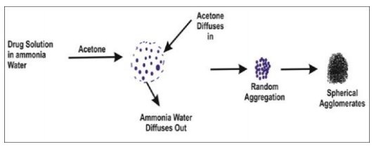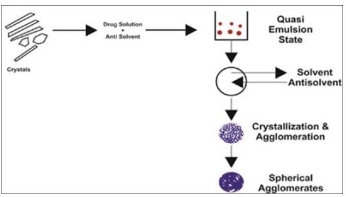 准乳液溶剂扩散机理首次被Kawashima等人提出。这种方法是在搅拌的作用下,将含有溶质的良溶剂分散到到反溶剂中形成准乳滴(良溶剂和反溶剂可以混溶)。良溶剂从准乳滴内部向外扩散,反溶剂向乳滴内部扩散,从而使乳滴内部溶质的过饱和度增加析出晶体,并且乳滴内剩余的良溶剂起到架桥剂的作用使晶体进一步聚结得到球形晶体。