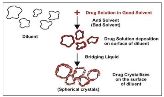 经大量研究证实许多球形结晶产生是以颗粒介导的,早期形成的小颗粒互相聚集,颗粒逐渐长大,过程中伴随结构重组。球形结晶是一种在结晶时的聚结过程,直接使药物结晶转化为紧实的球形形态。