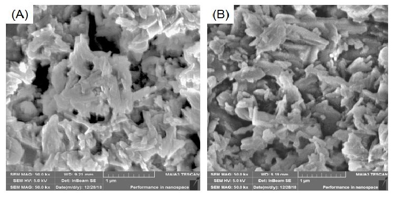 勃姆石(γ-AlOOH)为铝源,不同温度固相合成镁稳定β"-Al2O3粉末扫描电镜图:(A)1200℃;(B)1300℃