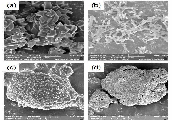 不同原料的SEM图:(a)γ-AlOOH(氢氧化铝制);(b)γ-AlOOH(九水硝酸铝制);(c)(α+θ)-Al2O3;(d)α-Al2O3