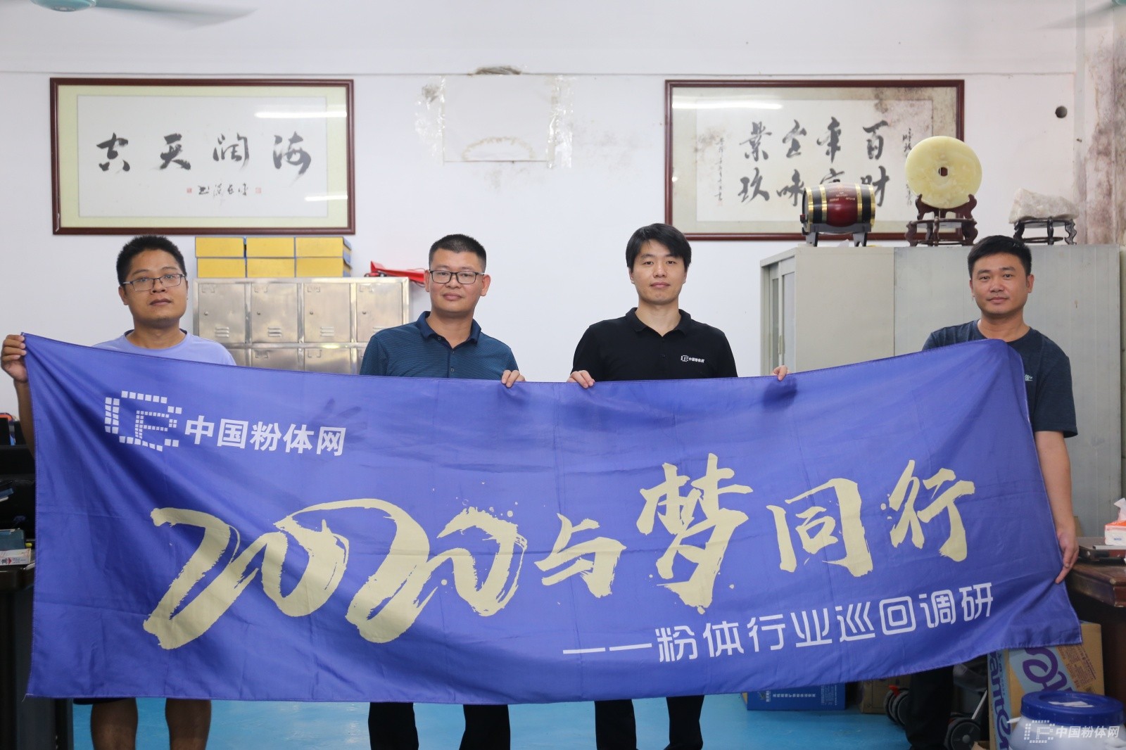 咏玖集团董事长江鹏(左二)、陈总(左一)与中国粉体网宋总(右二)、百特光电涂总(右一)合影