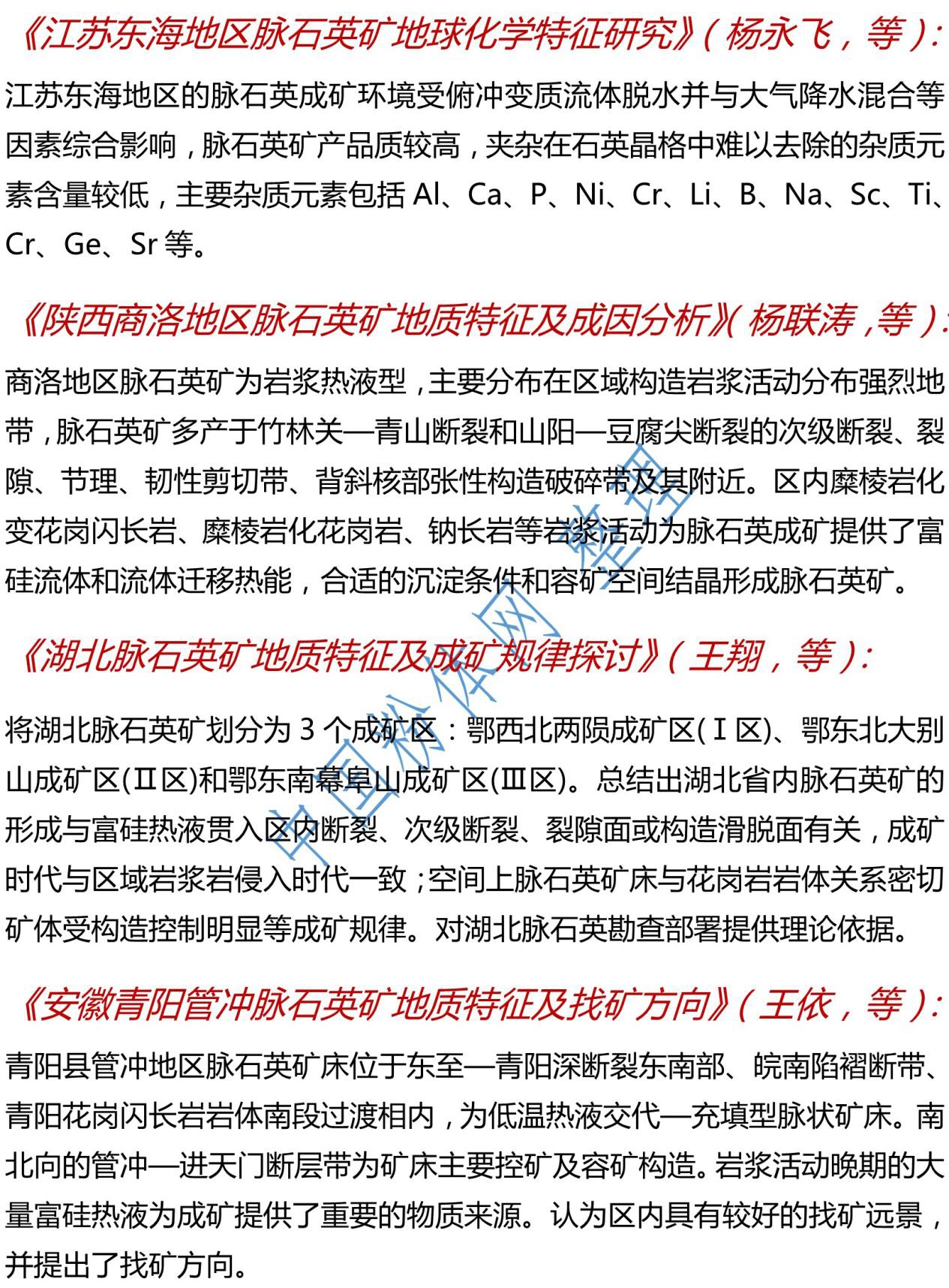 (1)脉石英矿产资源分布广泛,资源优势明显。但由于脉石英的形成主要与花岗岩有关的岩浆热液作用有关,其矿床规模一般不大,通常为中小型矿床。