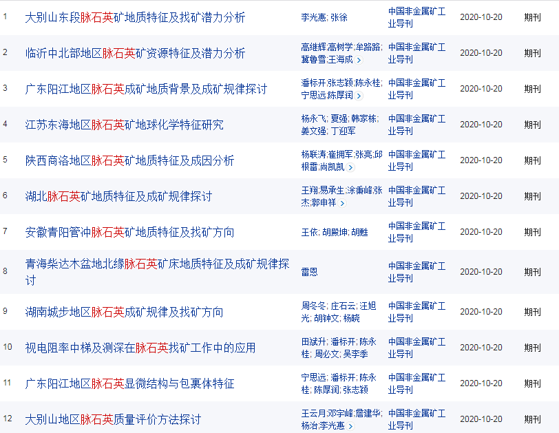 中国粉体网讯 中国粉体网编辑近日发现,在最新一期(2020年05期)的中国非金属矿工业导刊上,密集刊登了以“脉石英”为主题的十几篇相关论文,内容涉及全国各大矿区脉石英的成矿规律及找矿方向等专业研究。