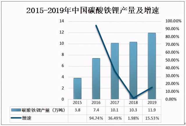 碳酸铁锂作为磷酸铁锂动力电池的原材料,其产量对磷酸铁锂动力电池行业的发展具有重要意义,2019年中国碳酸铁锂产量为11.9万吨,较2018年的10.3万吨同比增长15.53%。
