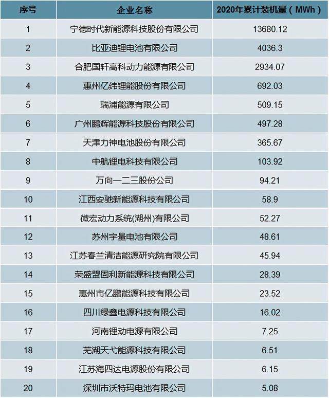 2020年中国动力锂离子电池企业磷酸铁锂电池装机量排名前20强