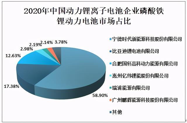 中国磷酸铁锂动力电池行业市场集中度较高,2020年宁德时代新能源科技股份有限公司磷酸铁锂动力电池市场占比为58.9%,比亚迪锂电池有限公司磷酸铁锂动力电池市场占比为17.38%,合肥国轩高科动力能源有限公司磷酸铁锂动力电池市场占比12.63%。