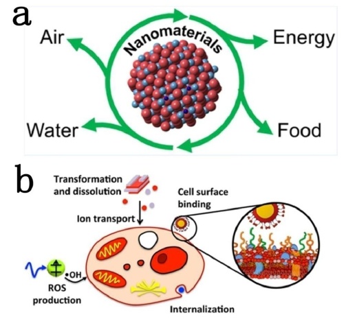 (a)纳米材料与人类(b)纳米颗粒与生物细胞初始相互作用的一些可能途径