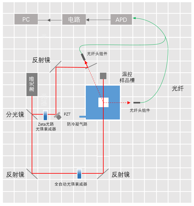 电泳光散射ELS技术是一种光学的测试技术,通过检测颗粒电泳运动产生的散射光的多普勒频移,进而分析原始的光学信号得到颗粒的电泳速度信息,由亨利方程建立的颗粒电泳速度和Zeta电位的关系最终得到颗粒在当前体系中ZETA电位ζ和ZETA电位分布信息。