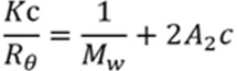 其中c为样品的浓度,θ为测量的角度(散射角),Rθ 为θ角方向的瑞利散射比,Mw 为重均分子量,A2 为第二维利系数,K为与(dn/dc)2相关的常数。