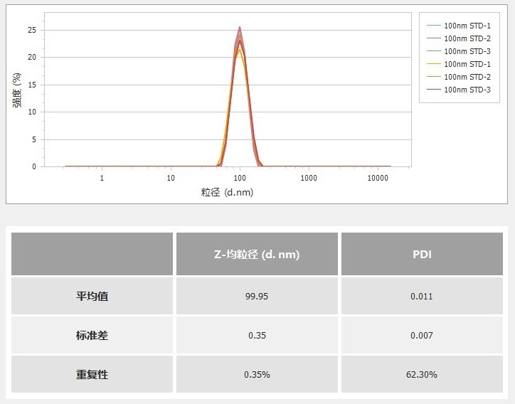 由于颗粒布朗运动而产生的散射光的波动随时间的变化。其中小颗粒造成的散射光波动速度较快,大颗粒造成的散射光信号波动较慢。APD检测器将散射光信号转化为电信号,再通过数字相关器的运算处理,得到颗粒在溶液中扩散的速度信息,即扩散系数D。通过Stockes-Einstein方程可以得到颗粒、大分子的尺寸,即流体力学直径DH及其分布。