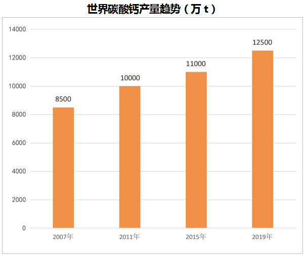中国粉体网讯 由于造纸、涂料、塑料、橡胶等材料工业的快速发展,市场对重质碳酸钙、轻质(纳米)碳酸钙等碳酸钙产品需求量越来越大。世界碳酸钙的生产能力在过去10年以年均增长率5%-8%的速度增长。据统计,2011年,世界碳酸钙产量约1亿t,其中重质碳酸钙超过8000万t,轻质碳酸钙超过1700 万t;2015年世界碳酸钙产量超1.1亿t,其中重质碳酸钙可达9000万t,而中国重质碳酸钙约为1500万t;2019年全球碳酸钙产量达到1.2亿t以上。