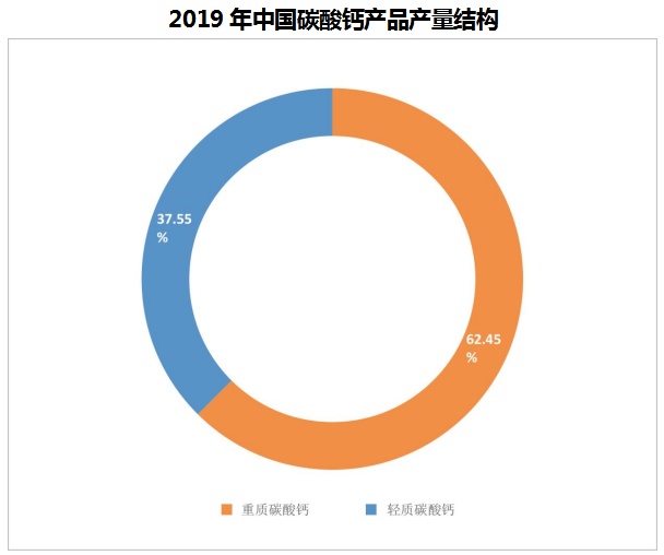 整体而言,国内目前以重质碳酸钙为主。2019年我国轻质碳酸钙产量1350万吨,而重质碳酸钙产量2245万吨,产量占比为37.55%、62.45%。