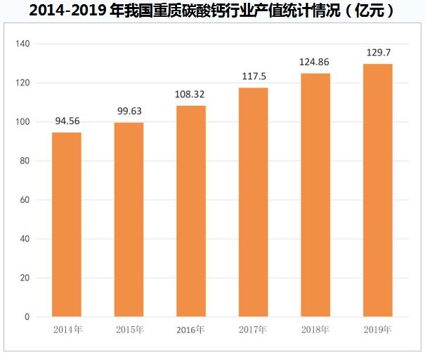 随着产量的持续增长,以及我国重质碳酸钙相关加工制备技术的进展,我国重质碳酸钙的产值近年来呈现持续上升态势。产值由2014年的94.56亿元增长至2019年的129.7亿元。