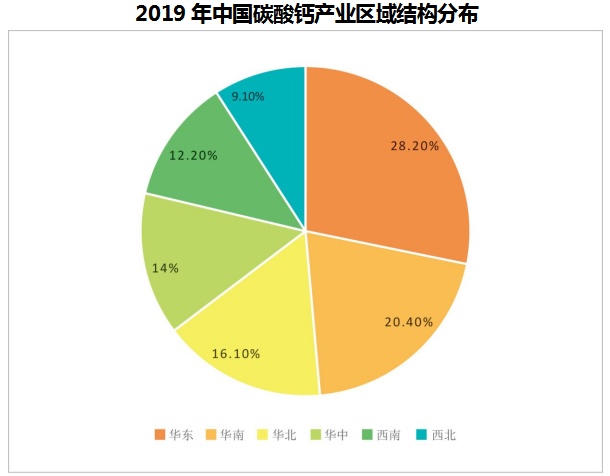 据统计分析,2019年碳酸钙产业主要集聚在华东、华南、华北,分别占据全国的28.2%、20.4%、16.1%。