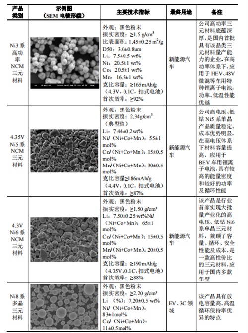 在BEV领域,目前行业用量最多的类型为Ni5系NCM三元材料,而公司目前以高电压Ni6系NCM三元材料为主,并已具备Ni7系、Ni8系NCM三元材料的量产能力。在HEV领域,电池正极更多的是使用高功率NCM三元材料,主要通过细化其一次晶粒、提升比表面积、缩小粒径等技术路线来实现高功率、高倍率性能。此外,公司还逐步将高功率NCM三元材料导入新型民用电动工具领域,已形成小批量生产。