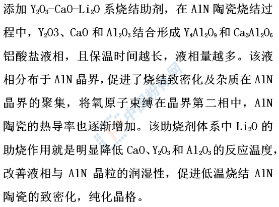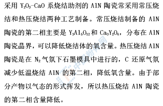 烧结助剂为某些稀土金属、碱土金属和碱金属等的化合物,例如:Y2O3、CaO、CaF2、Li2O等。在烧结体系引入烧结助剂后,一方面,它可与AlN粉末表面的氧化铝反应,形成低熔物,产生液相,利用液相传质促进烧结,提高材料的致密度;另一方面,烧结助剂与氧杂质反应,在晶界以Y-Al2O3和Ca-Al2O3化合物的形式析出,降低AlN晶格的氧含量,起到纯化晶格的作用,从而提高AlN烧结体的热导率。