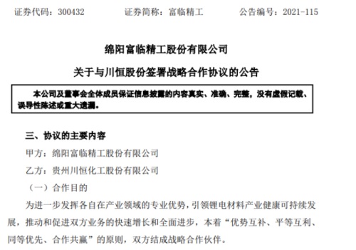 1、富临精工与川恒股份在磷酸铁锂正极材料领域达成合作