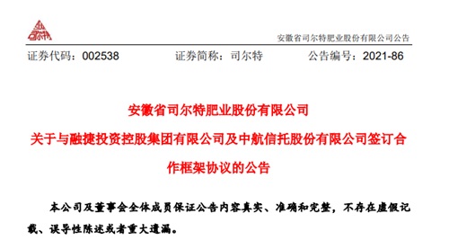 9月21日晚间,司尔特(安徽省司尔特肥业股份有限公司)发布公告称,公司拟与融捷投资控股集团有限公司、中航信托股份有限公司签订合作框架协议,就合作开发磷矿资源、合资生产磷酸铁和磷酸铁锂产品等相关合作内容进行约定。股权结构为:公司持有磷酸铁锂公司70%的股权,融捷投资持有磷酸铁锂公司30%的股权。