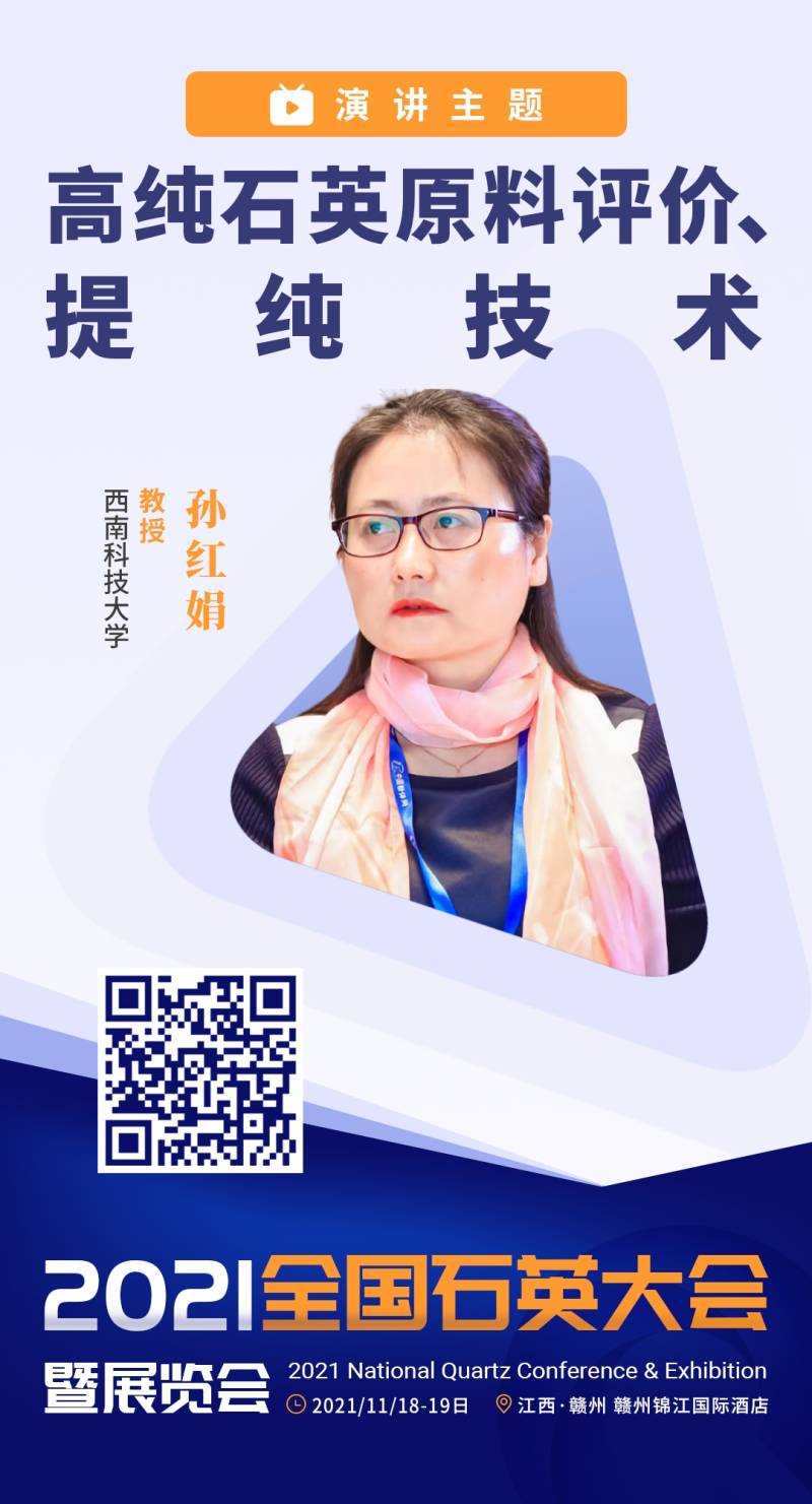 2021年11月18-19日,由中国粉体网主办的“2021(第五届)全国石英大会暨展览会”将于江西赣州锦江国际酒店举办,届时将邀请来自西南科技大学的孙红娟教授作《高纯石英原料评价、提纯技术》报告。孙红娟教授将从高纯石英原料评价与选择、高纯石英制备技术以及原料判别及提纯工艺举例等方面进行阐述,并从高纯石英中杂质元素赋存状态的角度对高纯石英原料进行综合评价。