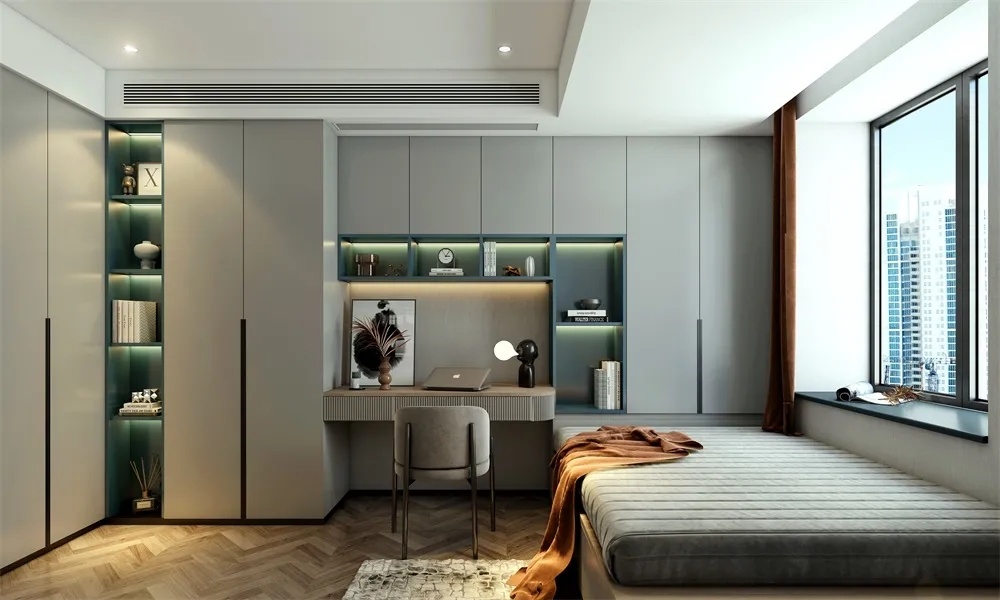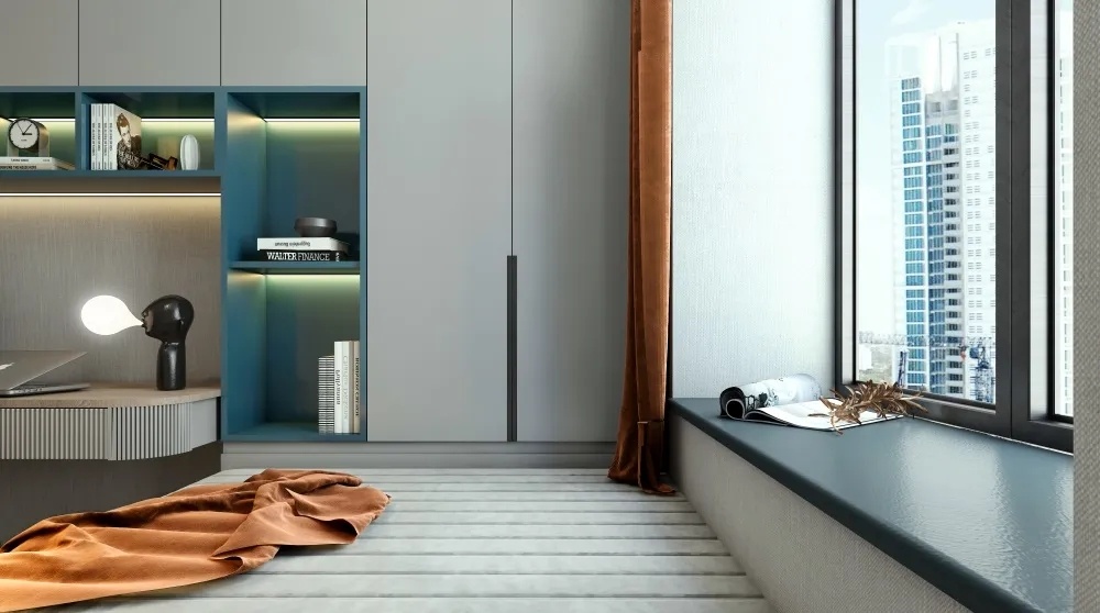 石英石硬度高、耐高温能力强,刮不伤,是做飘窗中绝佳材料。而莫兰迪色系,无论是深度色还是浅色系,低饱和度的配置几乎能搭配房间里的所有家具。