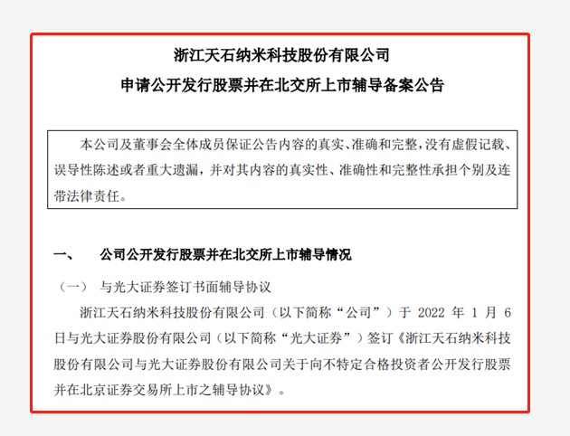 中国粉体网讯 1月10日,新三板公司天石纳米发布公告称,公司于2022年1月6日与光大证券签订了北交所上市辅导协议。2022年1月7日,公司向浙江证监局提交了交所上市辅导备案申请材料。2022年1月10日,浙江证监局对公司报送材料予以受理。