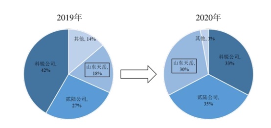 近年来,天岳先进在半绝缘型碳化硅衬底领域市场占有率大幅提升,已进入行业第一梯队,直接与国外巨头竞争。根据国际知名行业咨询机构Yole的统计,2019-2020年,在半绝缘型碳化硅衬底领域,天岳先进按销售额统计的市场份额均位列全球第三。2020年,天岳先进市场占有率较上年增长12个百分点达到30%,大大缩小了与国外竞争对手的差距。