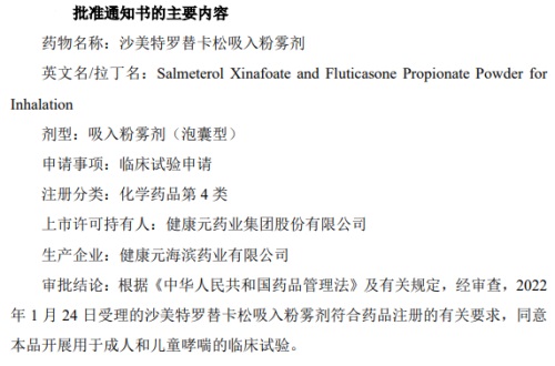 中国粉体网讯 近日,健康元药业集团股份有限公司收到国家药品监督管理局核准签发关于沙美特罗替卡松吸入粉雾剂的《药物临床试验批准通知书》。