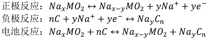 在放电时,离子从负极材料中脱出,向正极移动;而在充电时则相反,钠离子从正极材料中脱出,向负极移动。若以NaxMO2为正极材料,硬碳为负极材料,电池反应原理可表示为: