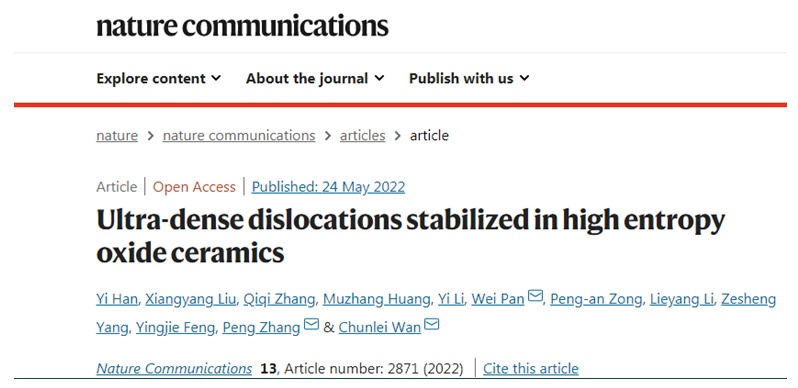 近日,清华大学万春磊教授团队在国际著名期刊Nature Communications上发表了题“Ultra-dense dislocations stabilized in high entropy oxide ceramics”的研究成果。