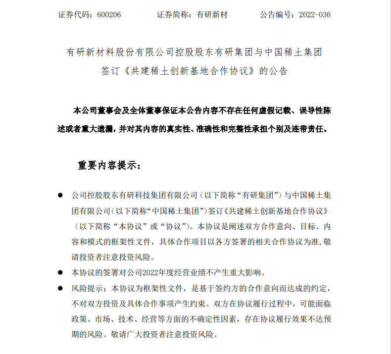 有研新材表示,在创新平台建设方面,有研集团支持中国稀土集团与有研新材在稀土领域开展资本合作,共同打造国际一流的稀土材料创新高地及稀土工程化高端人才培养基地;在科技与产业发展方面,围绕国家及行业重大战略需求,开展稀土战略前沿技术及关键共性技术研究,利用中国稀土集团资源优势及有研集团在稀土功能材料方面的技术积累和产业基础等优势,共同打造世界一流的稀土新材料产业集群;在咨询服务与人才培养方面,有研集团可为中国稀土集团提供稀土科技及产业发展战略咨询和人才培训等服务,双方探索研究生联合培养机制。