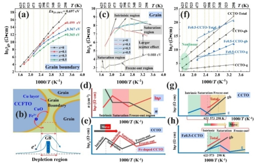 近日,中国科学院新疆理化技术研究所研究员常爱民团队通过对CaCu3Ti4O12(CCTO)陶瓷材料晶粒和晶界效应的研究,深度剖析了CCTO陶瓷材料电性能在高温区非线性的物理机制;通过Fe3+诱导CCTO陶瓷材料的能带结构,实现了CCTO陶瓷材料电性能在高温区的线性化。