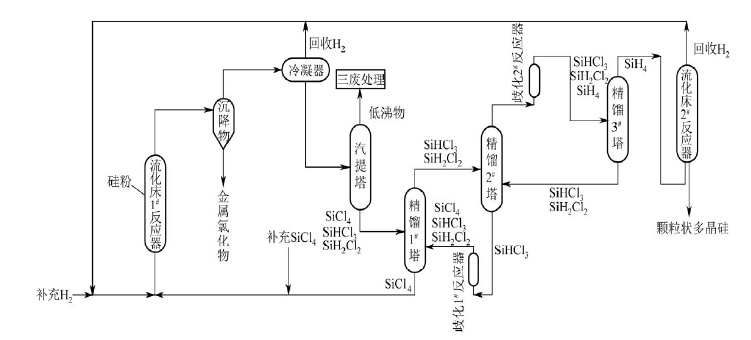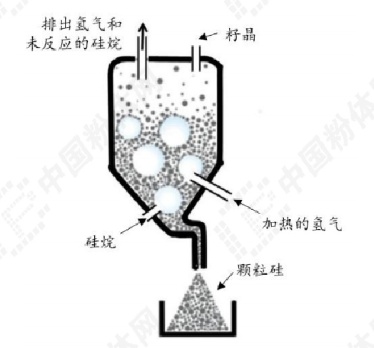 生产过程中,硅烷与氢气以一定速度从流化床反应器底部通入,将从反应器上部加入的作为沉积载体的高纯硅颗粒(直径为 0.2~0.6mm)导引至流化状态。在反应器外部加热器的作用下,硅烷在高纯硅颗粒表面发生化学气相沉积反应,使高纯晶种逐渐长大,从流化床底部取出大尺寸的颗粒产品,同时从上部源源不断的补充硅晶种,以此可实现生产的连续化。